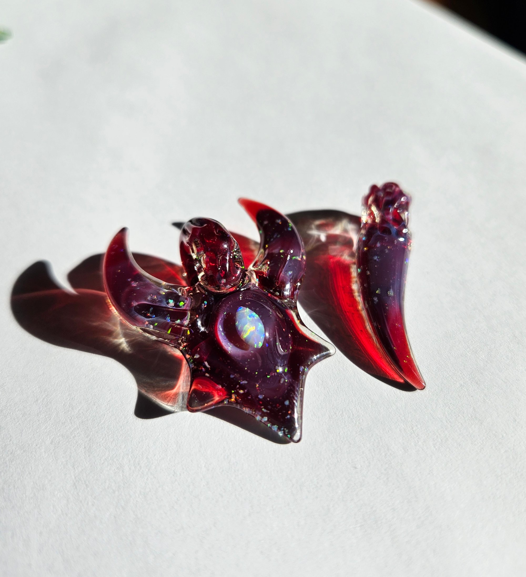 A mini opal tech spirit guide made from Phoenix and accented with a 3x5 pink opal. Matching mini fang included.