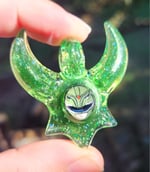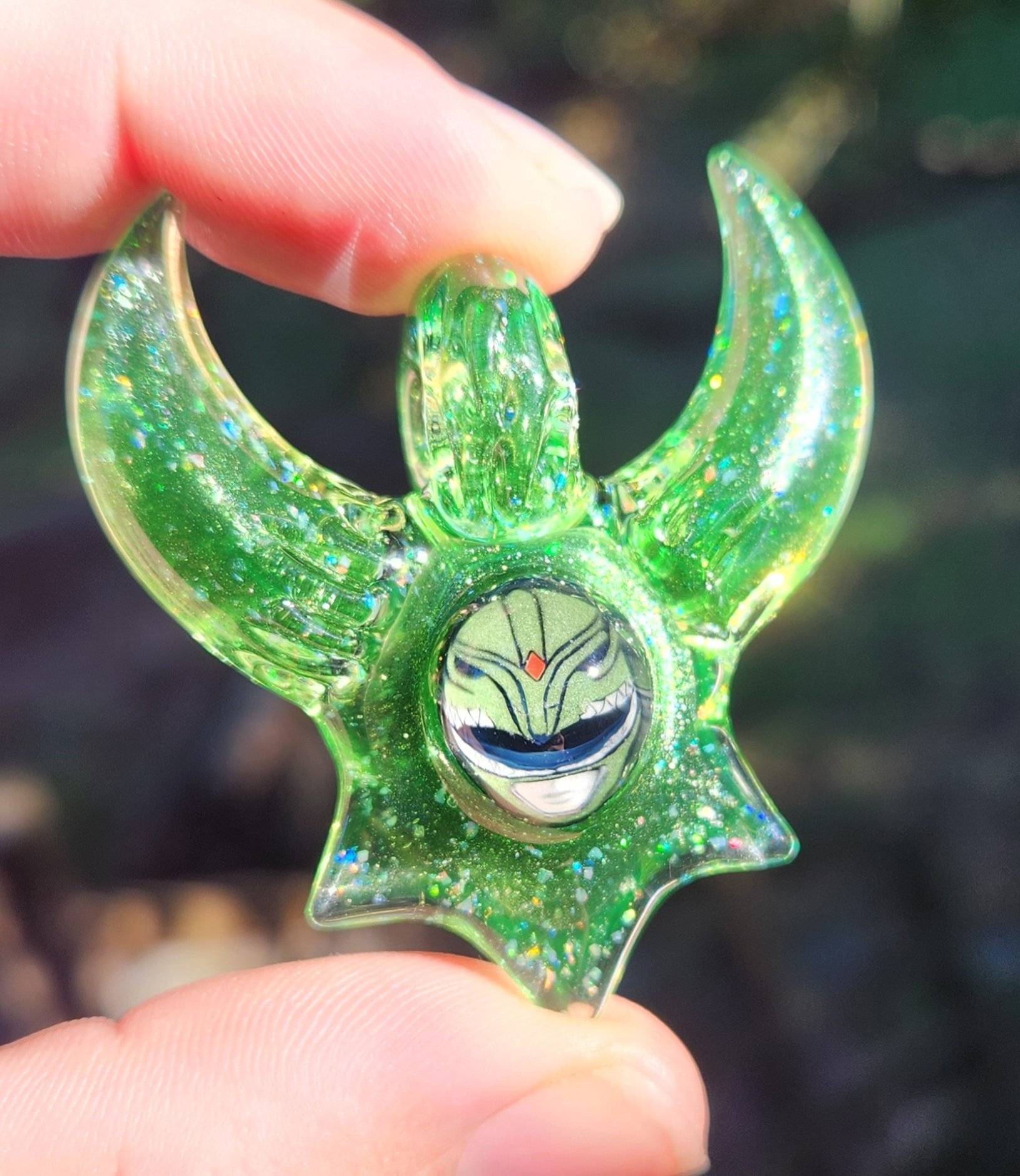 Emerald Opal tech wrapped around a ranger’s helm — a tribute to Tommy, the first Green Ranger. At its core, the millie stares back with the power of the Dragon Coin, the same force that summoned the Dragonzord from the depths. This pendant channels that wild, unstoppable energy, forged in borosilicate. Green stardust and Illuminati Opal tech. UV