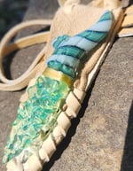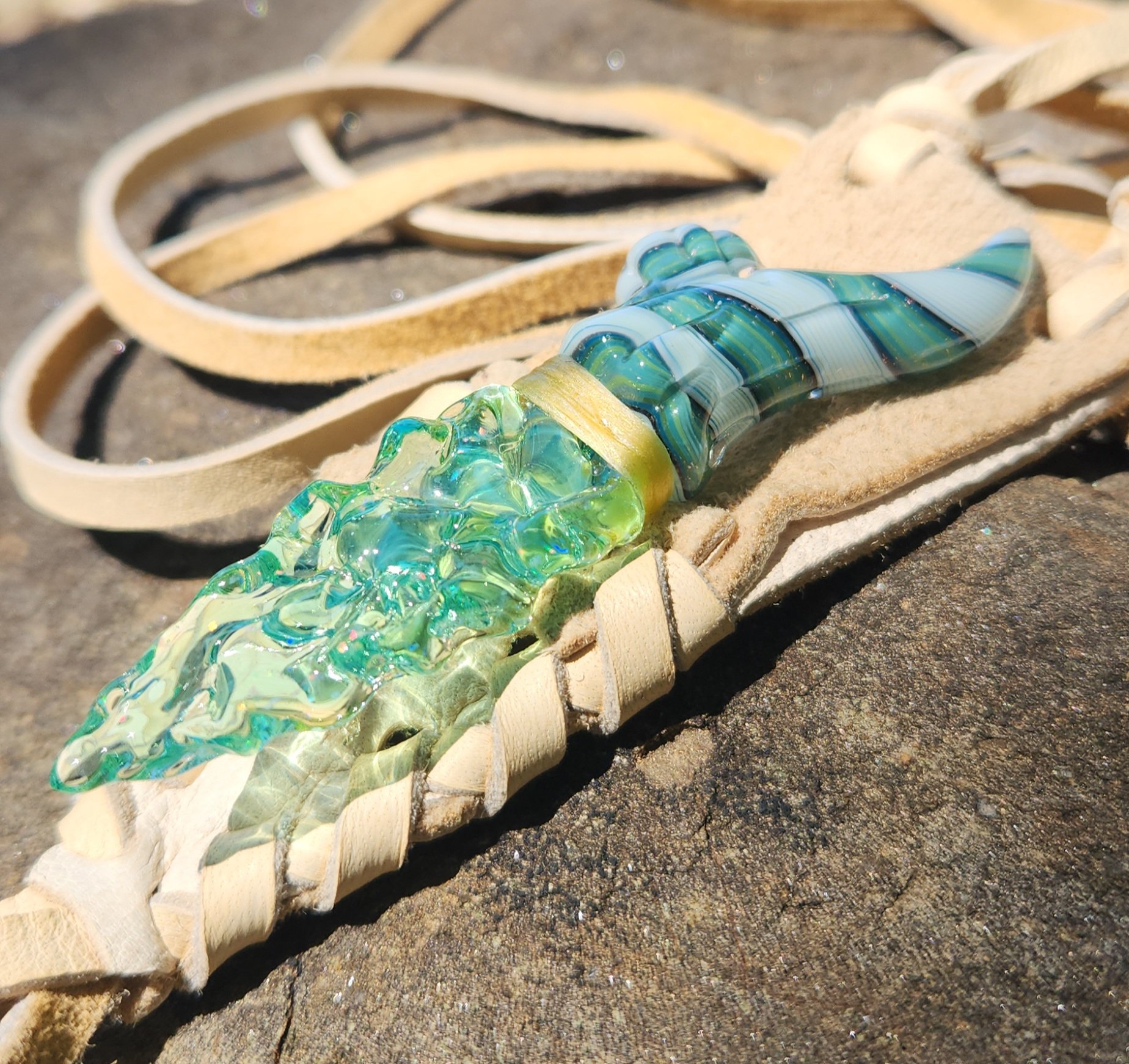 In collaboration with local artist Elks That Run. Born of light, this dagger radiates clarity and renewal. The blade glows with aqua-green opal-tech and blue-green line work. With shimmering dichroic glass, it comes alive with shifting color in its crevices. Bound in pale sinew and held in light deer leather, it feels as though it has traveled through time. Twin to the Obsidian Dagger, it mirrors its brother — two halves of the same legend, dark and bright. -- When wearing, be sure to keep your blade tucked below the sinew line for maximum security.