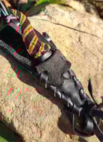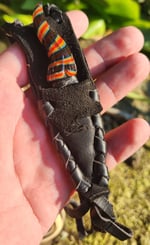 In collaboration with local artist Elks That Run. Forged in shadow, this dagger carries the weight of night. The blade is layered with rainbow linework and gold dichroic glass and black opal-tech, casting subtle sparks across its dark body. Bound in black sinew and set in black deer leather, it rests like an artifact drawn from the underworld. A weapon of silence and depth — brother to the Crystal Dagger, equal in power, opposite in light. -- When wearing, be sure to keep your blade tucked below the sinew line for maximum security.