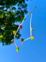 Delicate pearlescent Czech seed beads meet miniature produce charms—tiny lemons, mushrooms, tomato, and strawberry—hand sculpted from American borosilicate glass. Perfect for layering with other pendants and necklaces. 15'' + 2'' extender