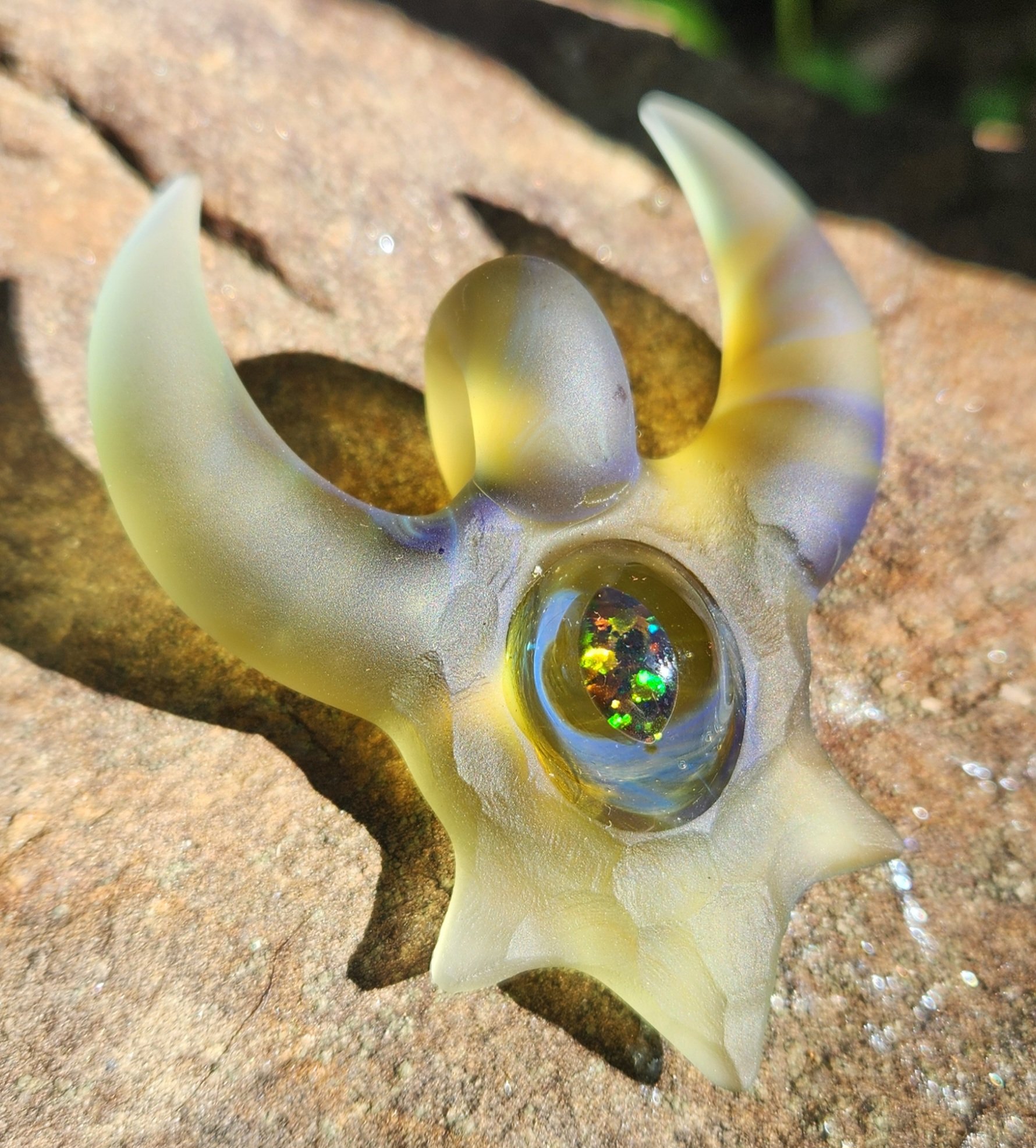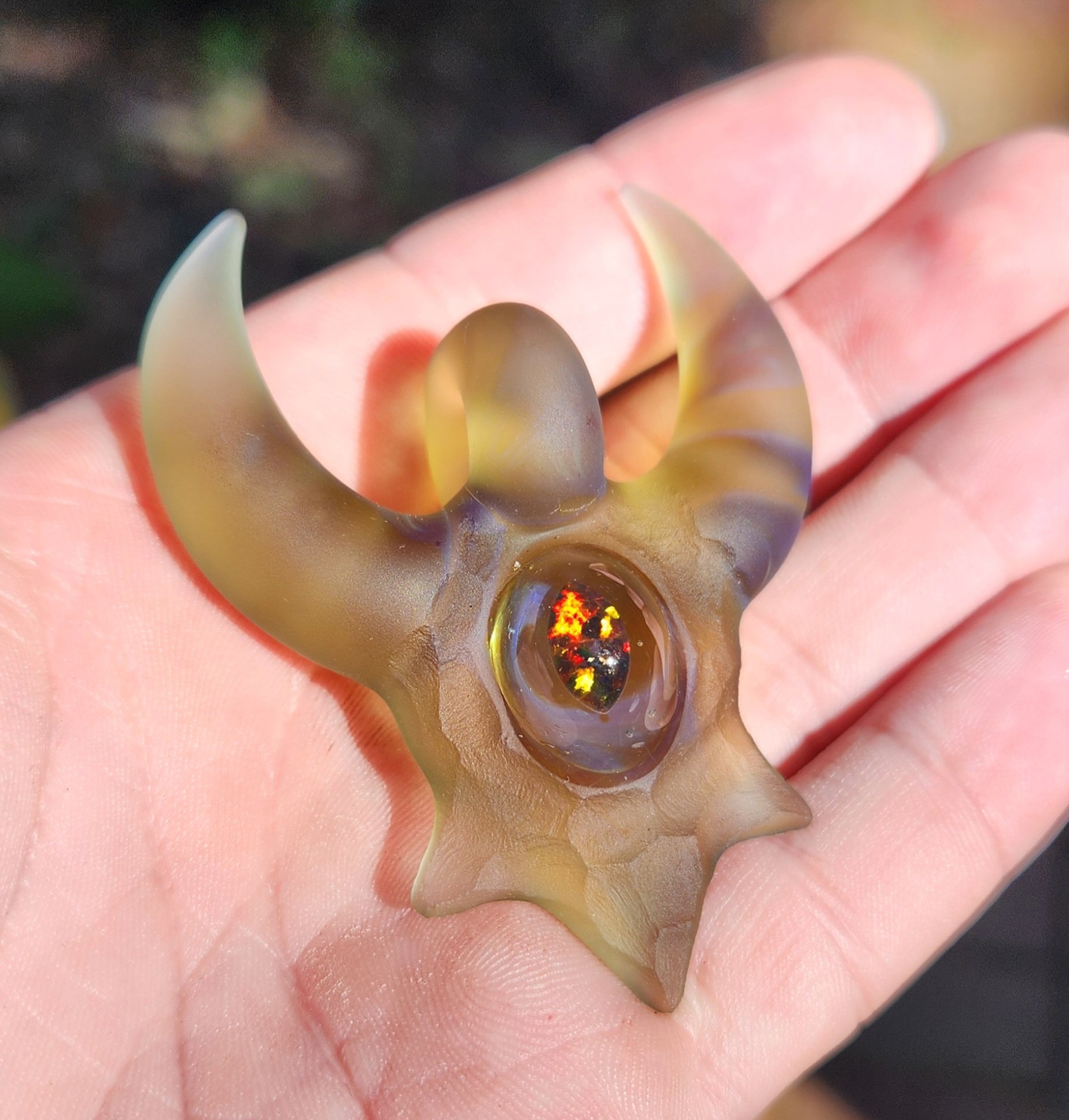 Cold-worked in spectral golds with hints of violet shadow, this horned pendant centers a 5x7 marquis opal that burns like a trapped ember. CFL reactive